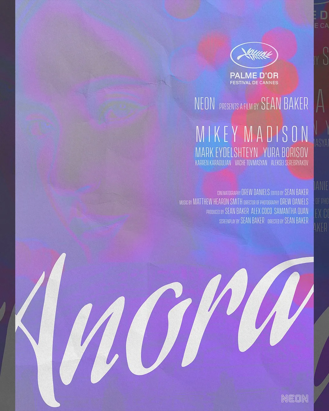 Poster for the release Sean Baker’s awarding-winning film Anora. Illustrated portrait of Mikey Madison as Anora in graphite pencil with colors and graphics created in Adobe Photoshop and Illustrator.